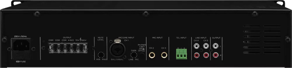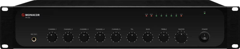 PA keverőerősítő 1 x 120Wrms Csendes működés a ventilátor nélküli konstrukciónak köszönhetően 3 mikrofon bemenet, az első szimmetrikus bemenet Mic 1 prioritás áramkörrel és automata talkoverrel 2 aux bemenet 1 telefon bemenet telefonközponthoz 1 vonal szintű kimenet Bemeneti és kimeneti szabályzók 2-utas hangszínszabályzó a kimenethez 48V-os fantom táp az 1. csatornán, kapcsolható 482mm (19") rack méret, tartozék rögzítővel |